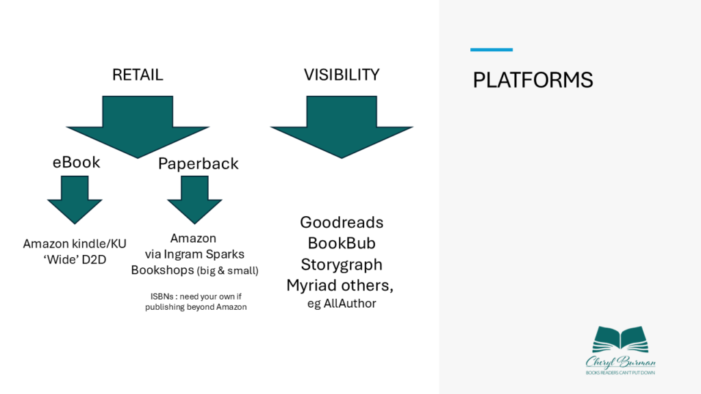 These are platforms which link to retail ones (mostly Amazon), and include GoodReads, Storygraph, and BookBub. There’s an automatic upload to Goodreads once the book is on Amazon, so check the listing to make sure it’s under YOUR name. (Goodreads Librarians FB group for help – see links). Storygraph – again check, as a reader might have uploaded the book, minus its cover perhaps! You can edit this.
