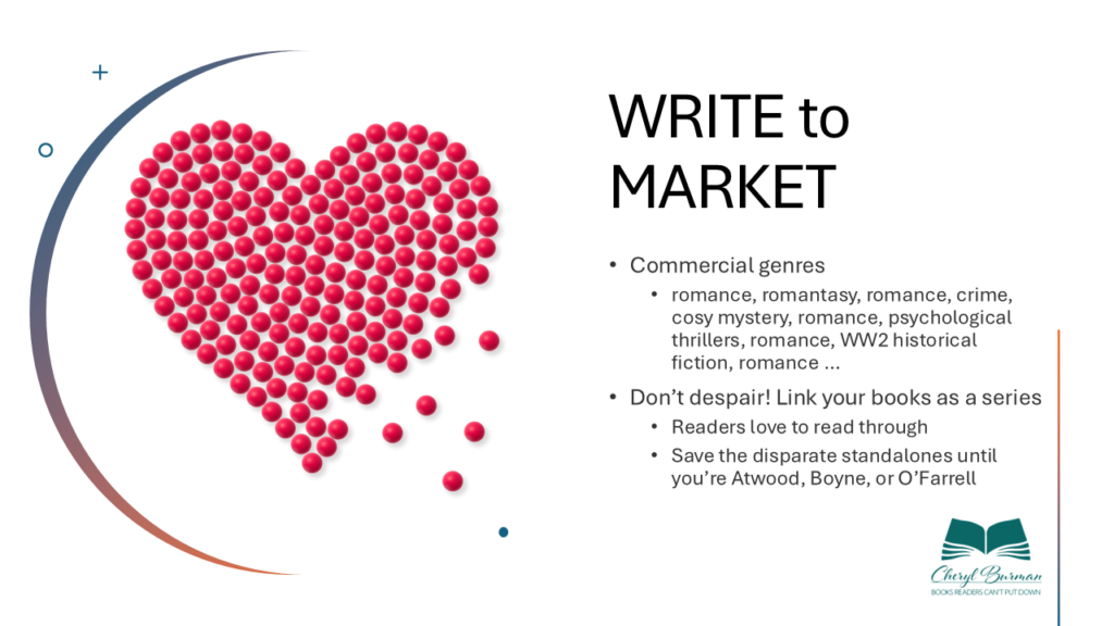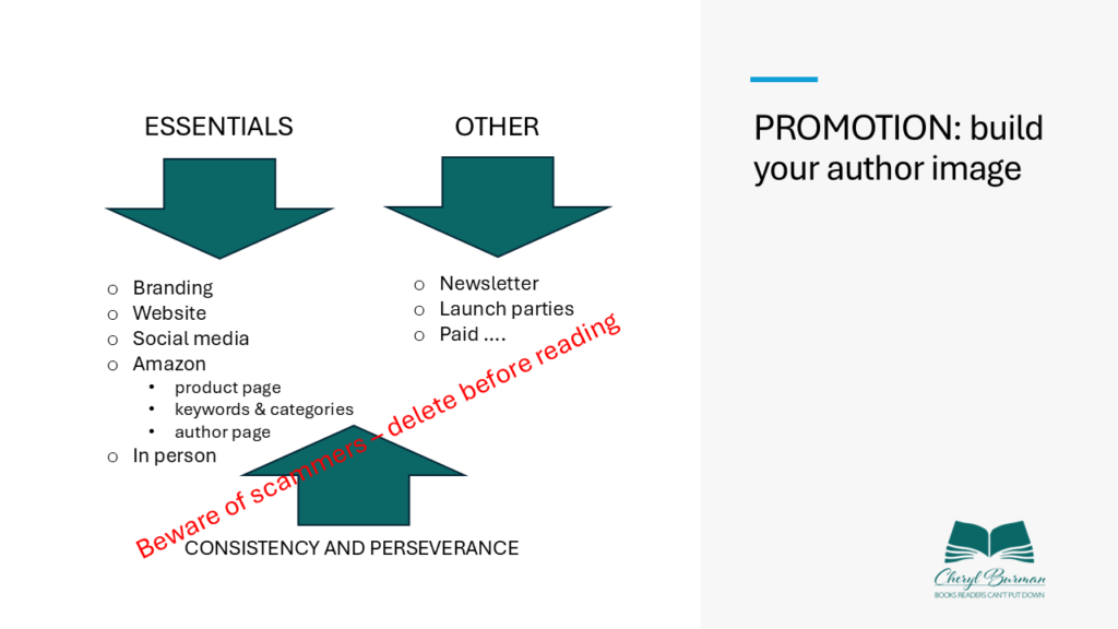 Social media: Set up an author page where you can legitimately talk about your book – and other writing related topics. Use your FB profile sparingly for this. Some authors set up book club pages to build a community of like-minded readers. Pick ONE that best matches what you write/you’re comfortable with. The aim is to be a human presence, not grow 20k followers. It’s not there ONLY to promote your books. Here’s some feedback from a book retailer – her best sellers are all from authors active on SM because people recognise the covers and feel more comfortable for that reason.