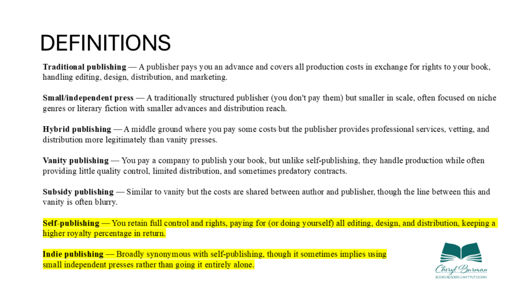 Essentially, self or indie publishing means you’re responsible for all aspects of your book, from writing it to getting it into people’s hands. You can contract out some of these aspects – editing, covers, formatting, for example – but you’re in control