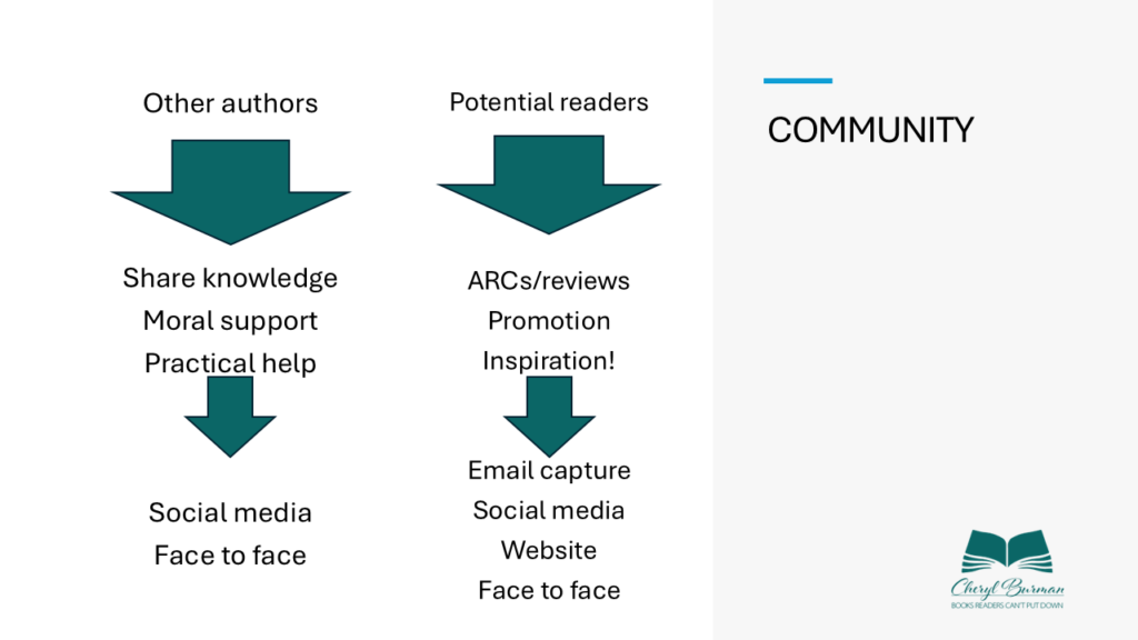 Find your author community through a local writing group, but more likely online. I found mine through Twitter, and now have an online Zoom group, but you can find community on Facebook and other social media too. Look for other authors whose work you like and reach out – not via direct messaging initially! Build the friendship first.
