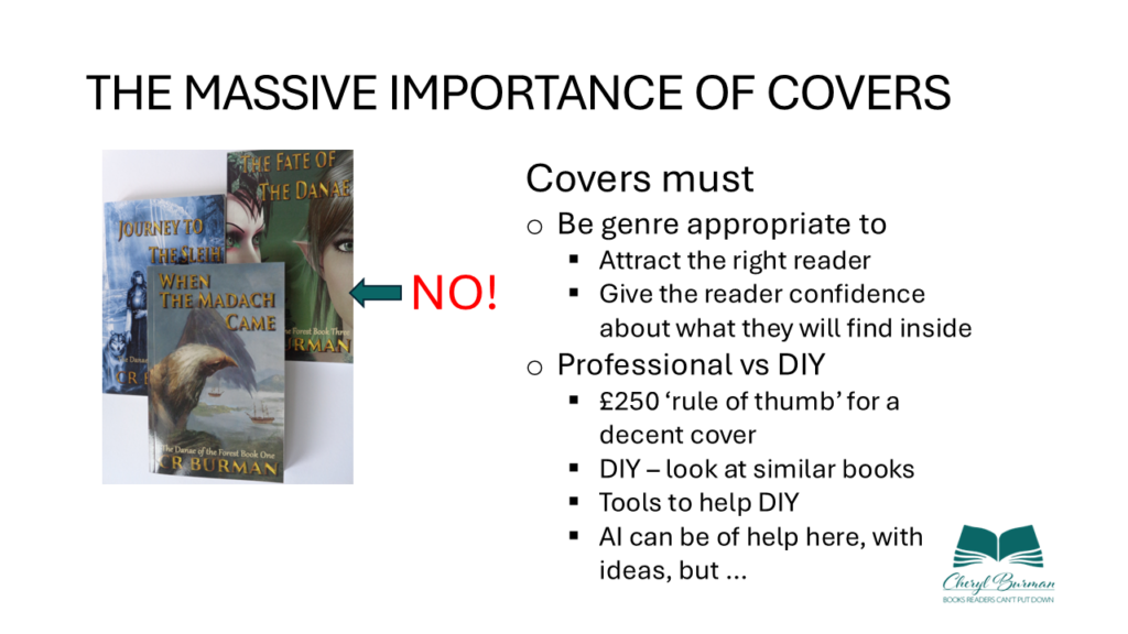 If you or someone you know has professional tools like PhotoShop and InDesign, beg them to help/do! At a more basic level, BookBrush (which is exclusively for authors) has cover templates which are 100% adjustable, and Canva is a popular tool with authors. Images come from free and paid sources, and ensure you understand copyright and paying. AI can be useful to generate ideas, and you might get lucky with something usable. But you don’t want your cover to look AI gen (unless you’re writing Victorian orphan/seduced maid novels, which do very well, thank you).